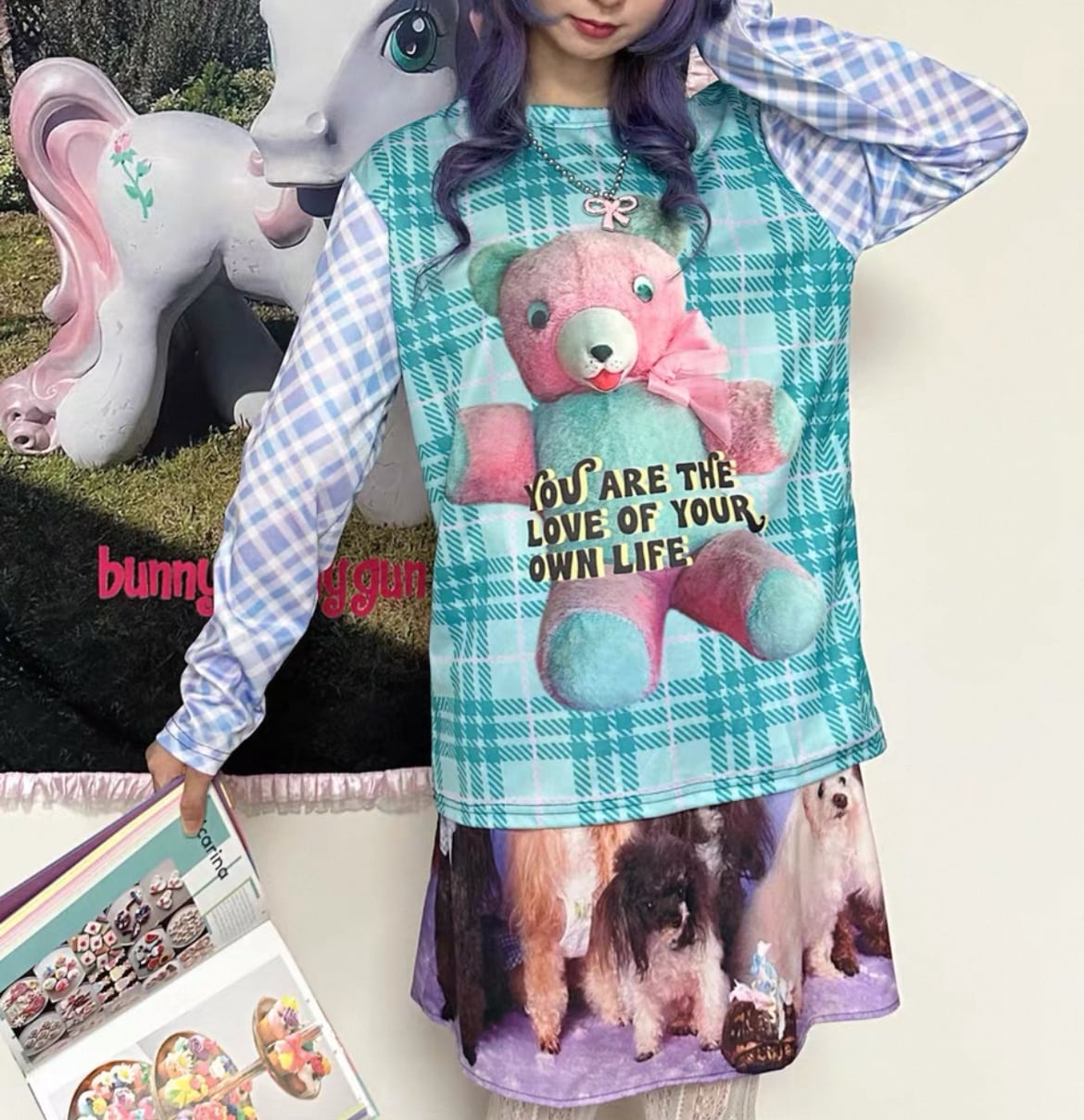 ★カラフルなくまちゃんのWプリントカットソーです♡♡切り替えチェックが安定の可愛さ^_^