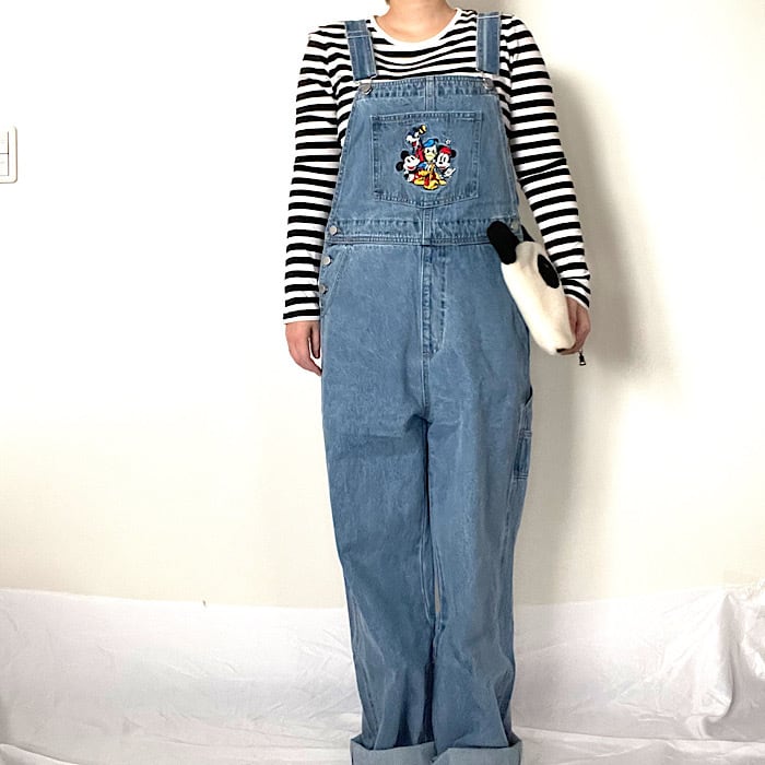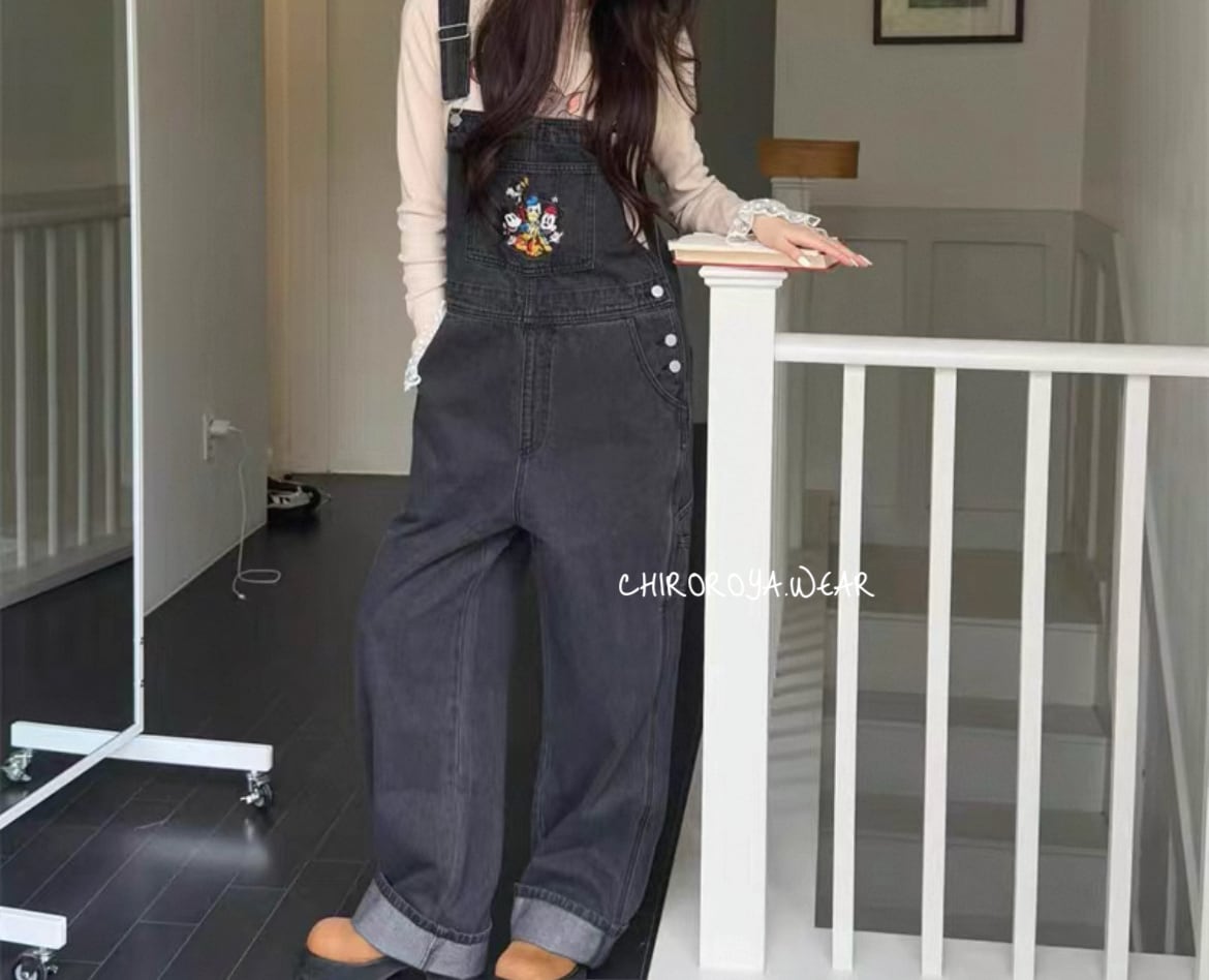 ★ミッキーフレンズの刺繍が印象的なデニムサロペット^_^USED風で可愛いデザイン♡