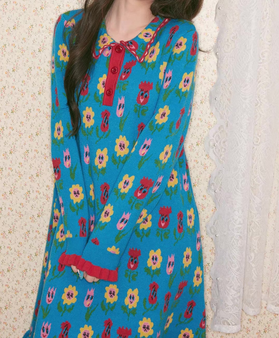★可愛い顔のお花総柄が可愛いレトロニットワンピース♡ライトブルーが色鮮やかです^_^