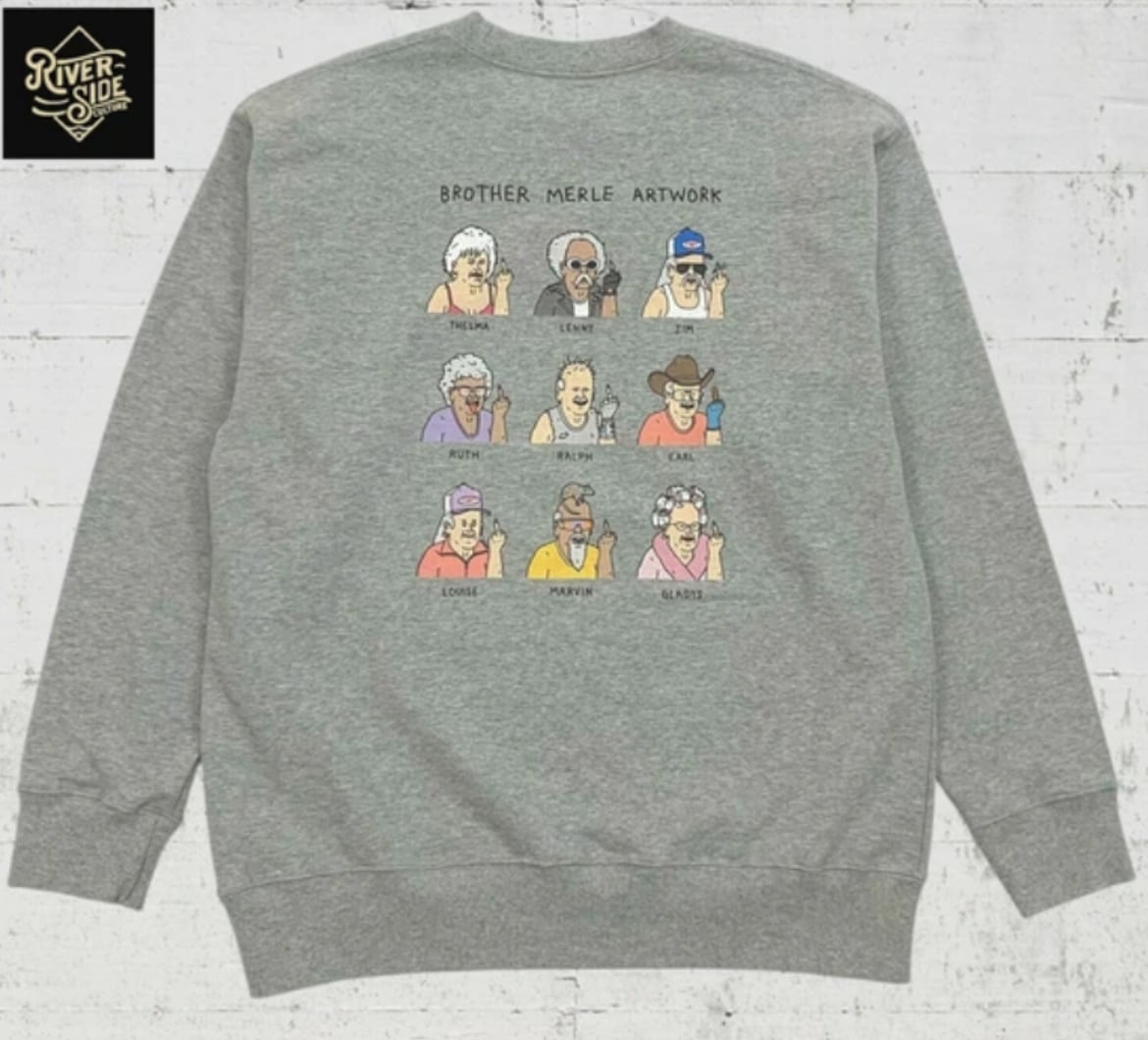 大人気シリーズのトレーナーが登場。今回はヘビーウェイトの裏毛を使った重量感のあるトレーナーになっています。FRONTのプリントはBrotherMerleの定番のロゴのワンポイントプリント。BACKはおじいちゃんとおばあちゃんのオールスターズによるF●UKしてるブラザーマールならではの個性のある一枚になっています。