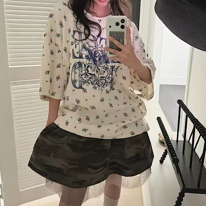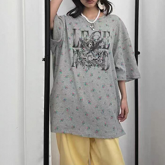 ★可愛いサーマル地に小花柄デザインのビッグサイズTシャツです♡